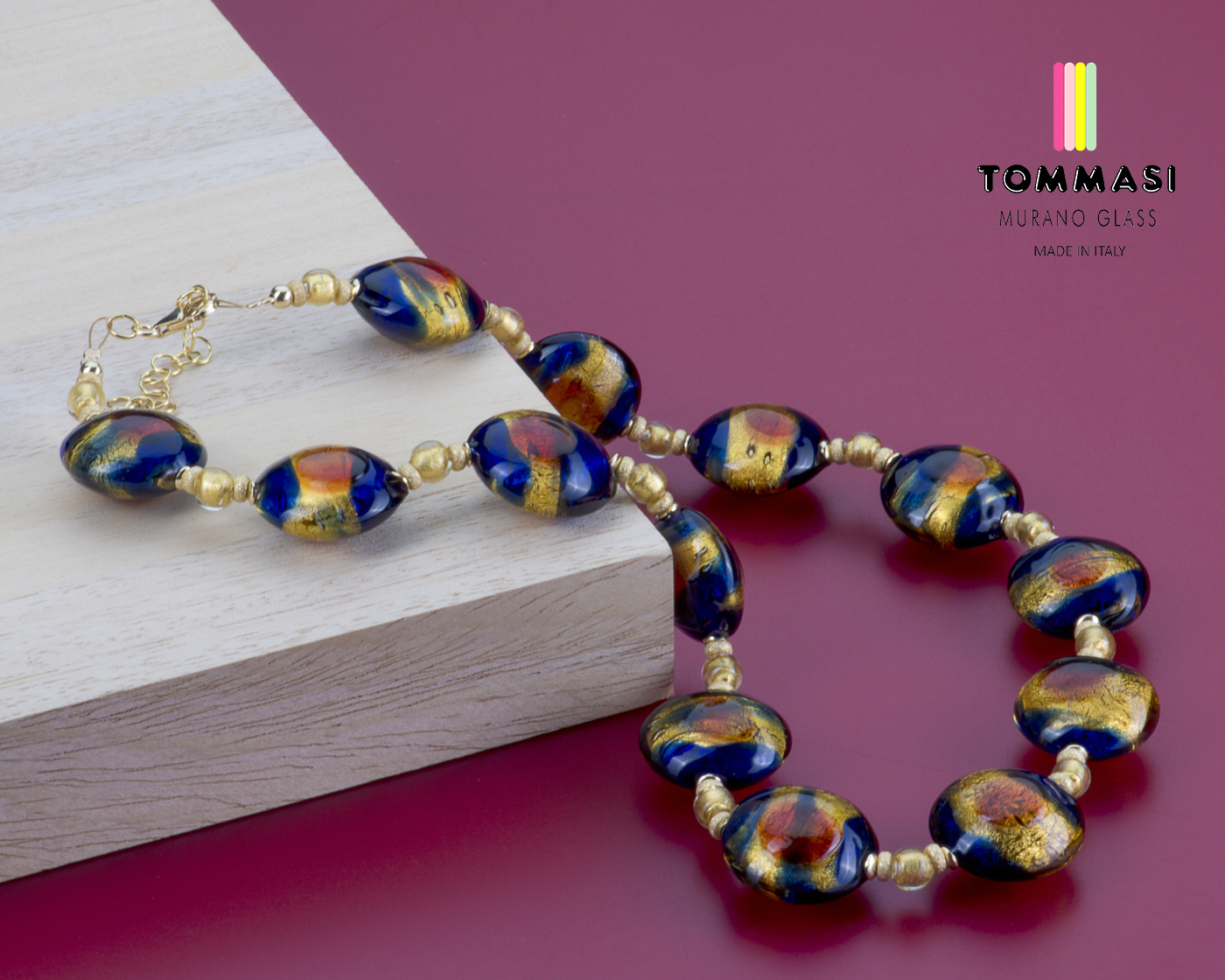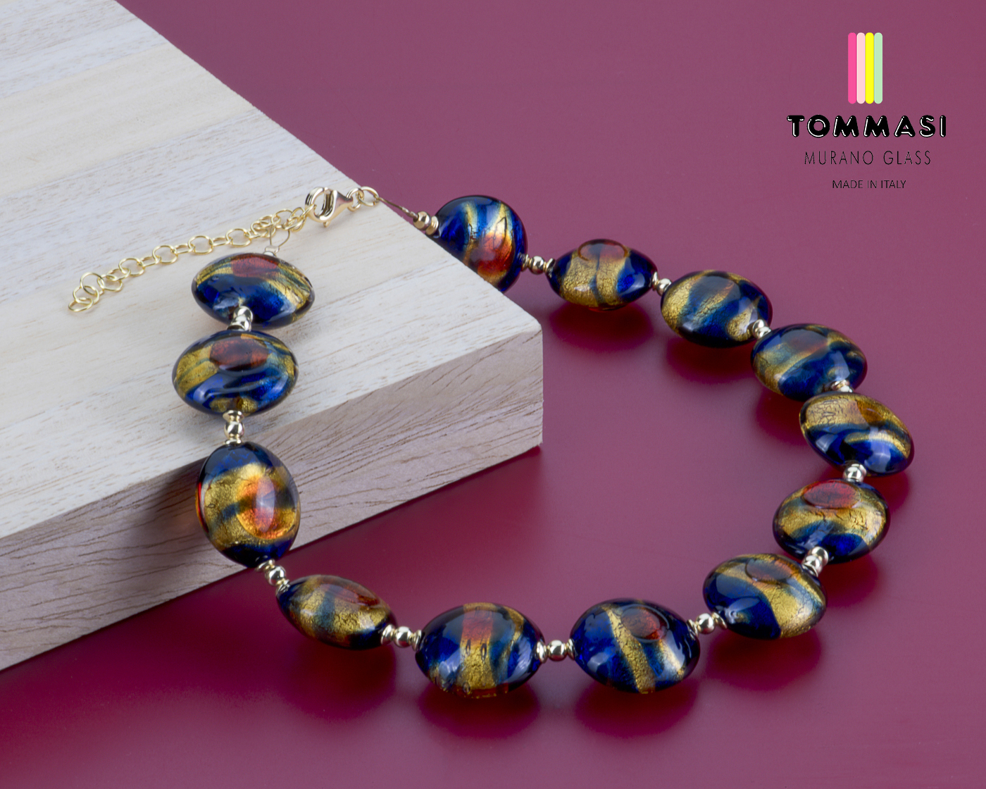 Glass Necklace with disc beads gold leaf 24kt ,blue color tone,50 cm adjustable lenght . Silver 925 components rhodium plated. Gift box and certificate card Tommasi Murano